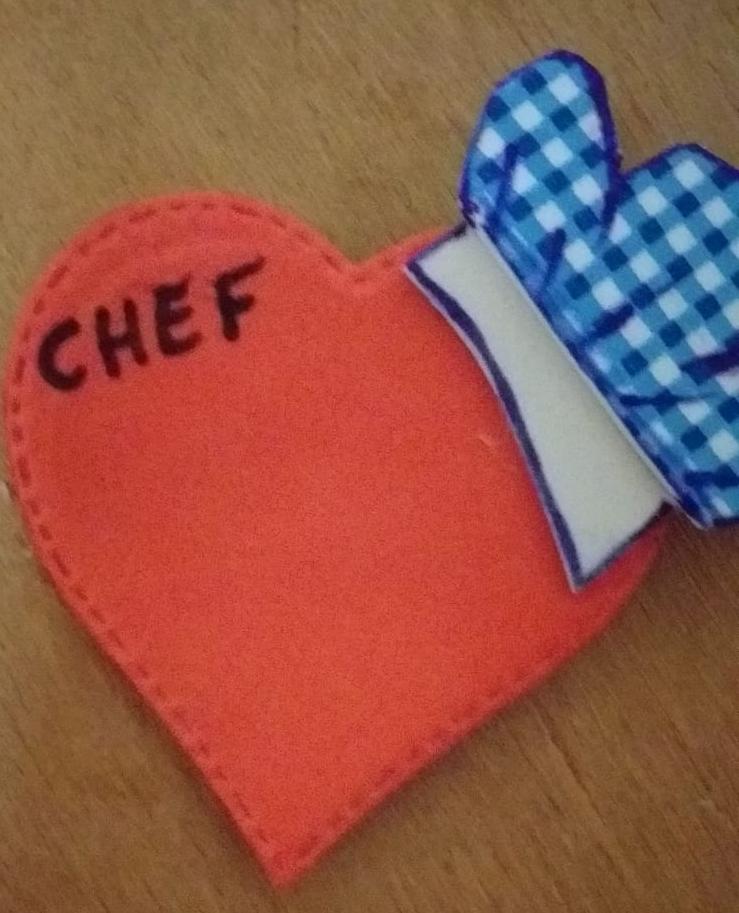 Para finalizar el taller hemos querido hacerles un pequeño detalle de un corazón con un gorrito de cocinero dándoles el distintivo de que se han convertido en maravillosos chefs, y que el «Chef que cocina con el corazón, cocina amor»