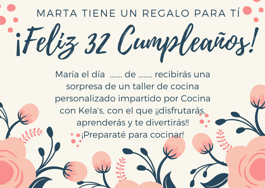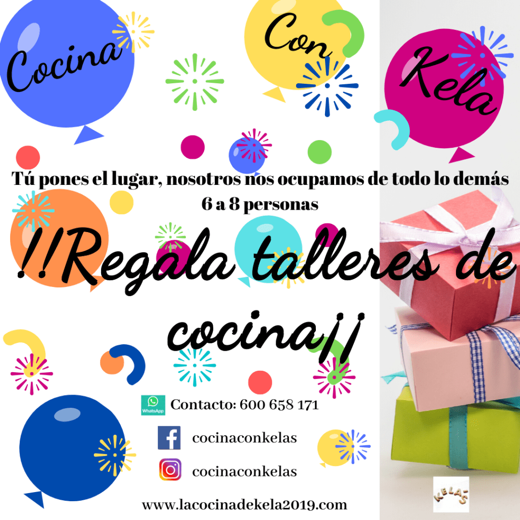 Pues en cocina con Kela queremos ser originales y queremos que puedas sorprender a tu mejor amiga, a tu prima o a tu novio, o incluso a tus hijos que les gusta hacer sus pinitos en la cocina y son unos fans incondicionales de los programas de televisión de cocina, o que se meten en la cocina y se vuelven locos con alimentos, ollas y fogones en sus manos. Y para eso estamos nosotros para ayudarte a sorprender de una manera especial, regalando un taller de cocina personalizado, nosotros nos ocupamos de todo, le felicitamos el día de su cumpleaños de forma personalizada ya sea por whatsapp, Instagram, Facebook o por teléfono, enviándole una tarjeta de felicitación informándole de su regalo. Le ofrecemos una serie de platos donde elegir para poder realizar en el taller o incluso nos acoplamos a lo que quiera aprender más específicamente. Es lo que llamaríamos un regalo totalmente dedicado para esa persona especial a la que quieres hacer feliz ya sea para su cumpleaños, para un día importante que tenéis entre vosotros o por el simple hecho de hacerle un regalo por ser alguien especial para ti, pues que mejor que hacerle feliz con lo que le apasiona.